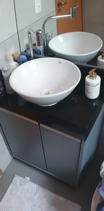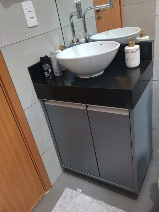 Móveis planejados no banheiro e no gabinete da cozinha.