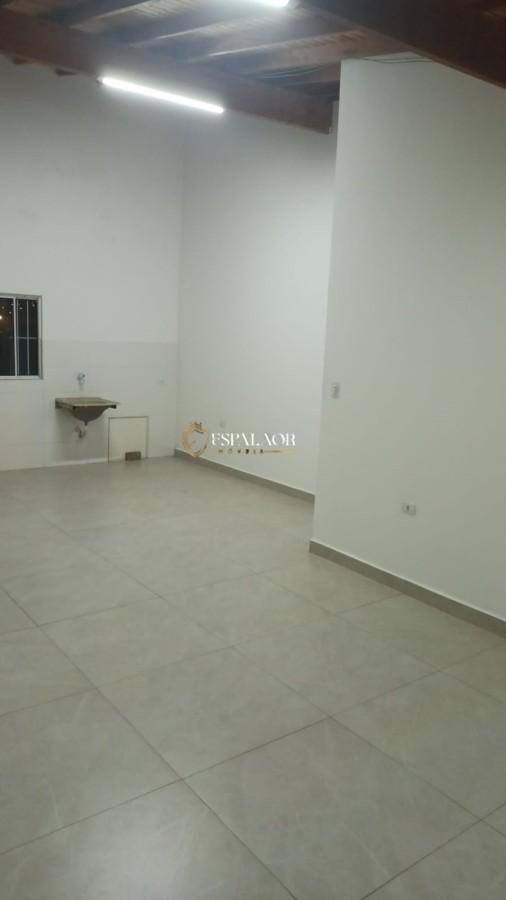 Espaço tipo salão ou apartamento com estrutura para cozinha, área de serviço e banheiro.